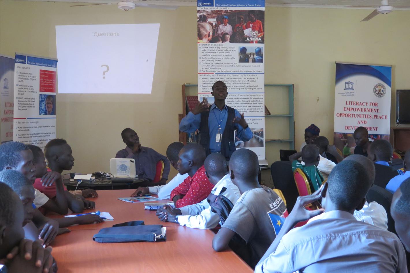 The Communication and Public Information Section in Torit presented its work and explained the new UNMISS mandate to 32 attending youths. The first Director General from the State Ministry of Information, James Lemor, praised…