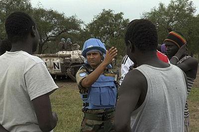 Indian peacekeeper speaking with local residents during patrol in Pibor County, Jonglei State. Photo: UNMISS/Gideon Musa