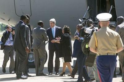 U.S. Secretary of State John Kerry with Ambassador Susan Page and South Sudanese government officials after he arrived in Juba as part of efforts to end conflict. Photo:UNMISS/Isaac Gideon