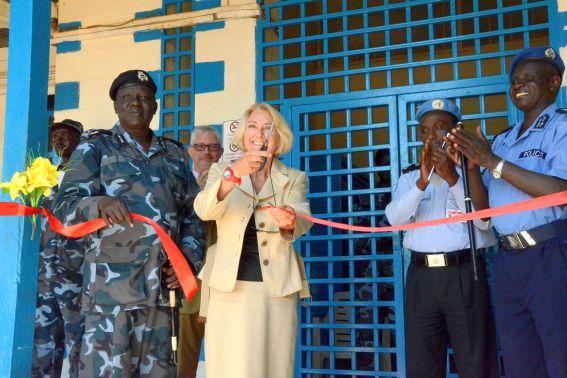 UN Mine Action Service (UNMAS) Director Agnes Marcaillou cutting a ribbon to inaugurate an armoury in Juba on 19 September. UNMAS, in partnership with the Mines Advisory Group, refurbished the armoury at the Central Equatoria…