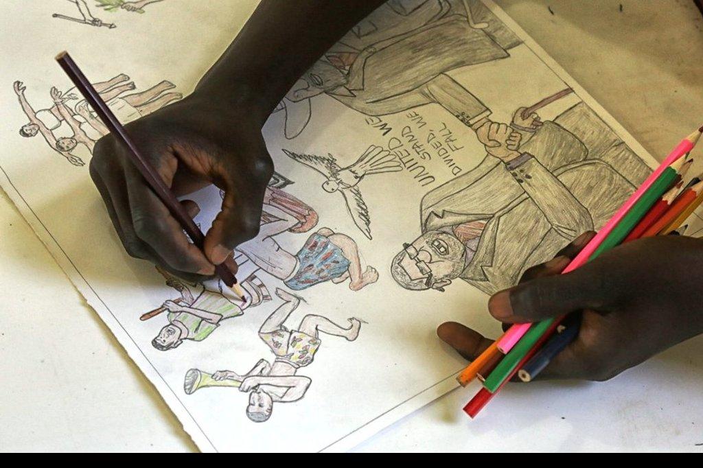 A blank canvas. Imagination, pencils and brushes in motion. “I remember seeing how happy my father was when South Sudan gained independence in 2011. I want to see people happy like that again; this is why I drew this picture…