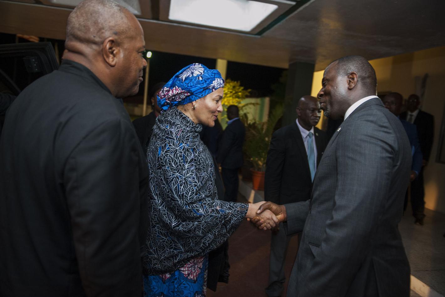 The United Nations Deputy Secretary General, Ms. Amina J. Mohammed (center), greets the acting Minister of Foreign Affair of Liberia, Elias B. Shoniyi (right), at her arrival at the Roberts International Airport in Harbel, Liberia. She is visiting Liberia to attend the celebrations of the completion of the UNMIL Mandate. ©UNMIL Photo: Albert Gonzalez Farran