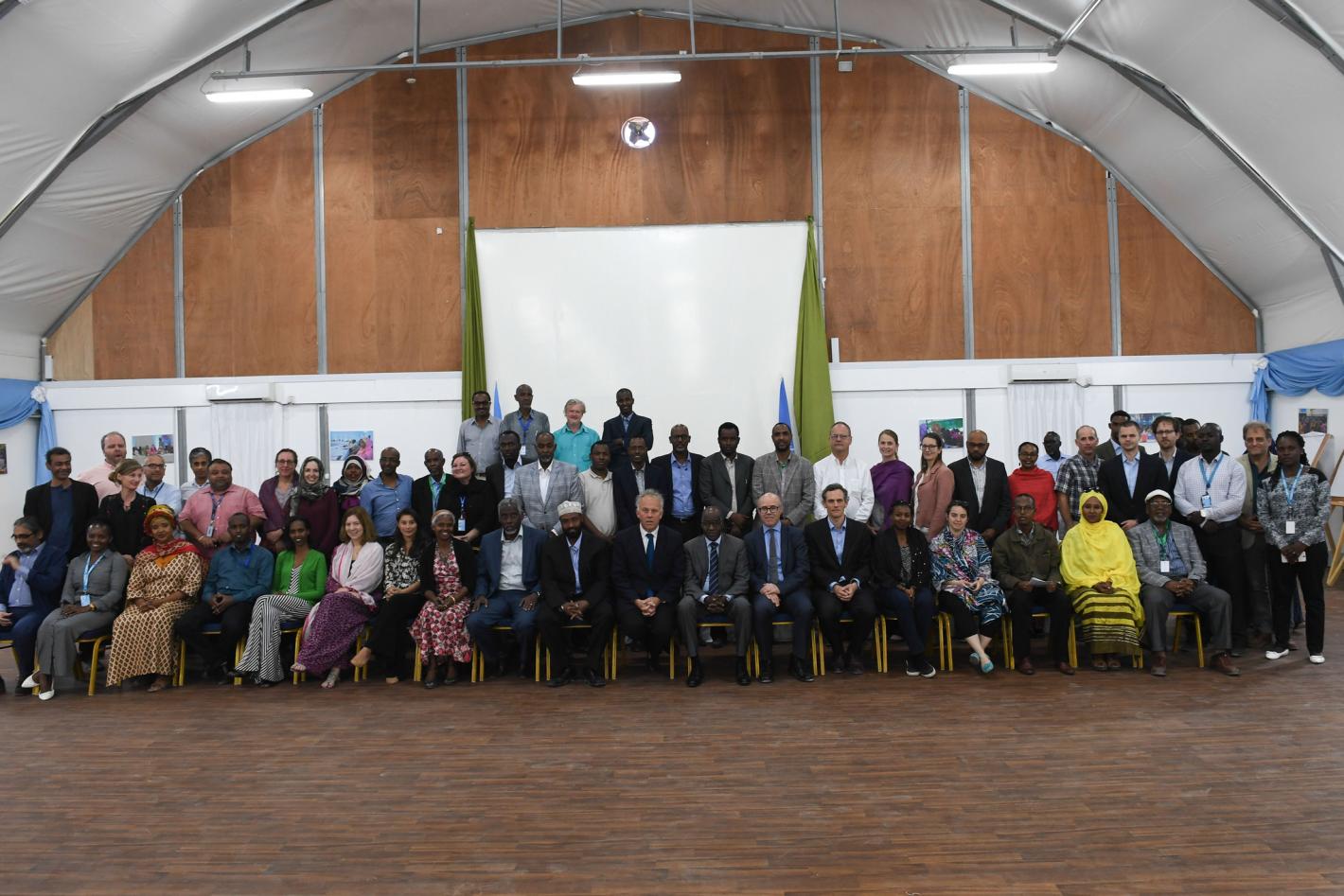 Participants in the opening session of a three-day colloquium on peace and reconciliation pose for a group photo in Mogadishu on 11-13 February 2018. The event was co-hosted by the Federal Government of Somalia, UNSOM and the Government of Norway.