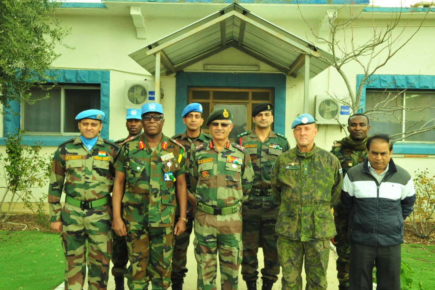 Lieutenant General Ajae Kumar Sharma, and his staff, with FC/ HoM UNDOF Major General Francis Vib- Sanziri, DFC Brig Gen Koskela and OC Logbatt Lt Col W. S. Siddarth