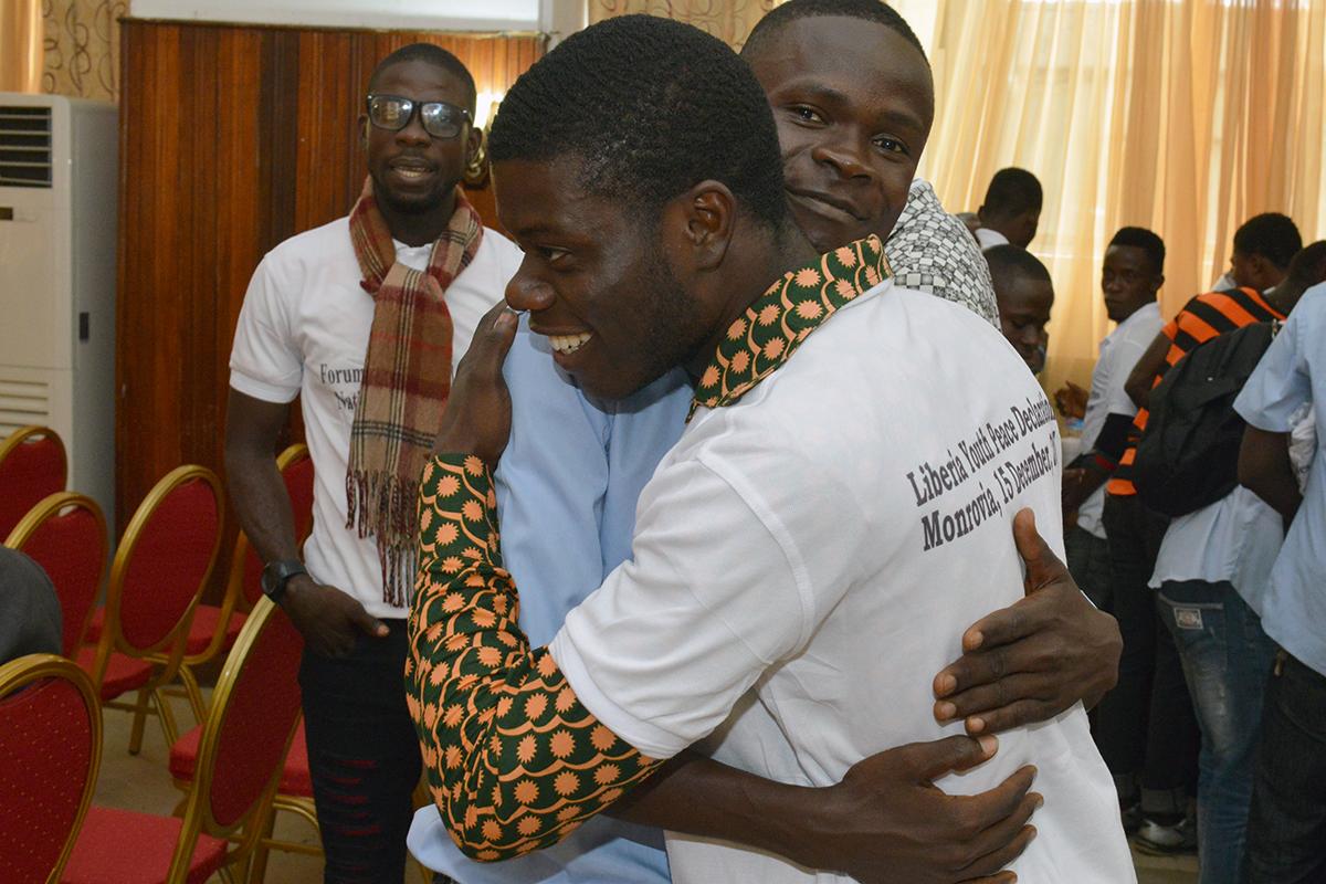 15 November 2017, Monrovia - Friendly hugs between members of Youth Political Party National Youth League at the signing of the Liberian Youth Peace Declaration. ©UNMIL Photo: Shpend Bërbatovci
