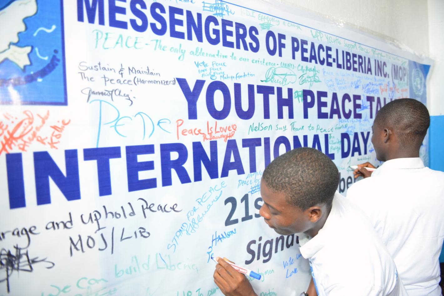 1 September 2017, Monrovia – Students writing peace messages on the banner dedicated to the International Day of Peace event in the University of Liberia. ©UNMIL Photo: Clement Atitwa