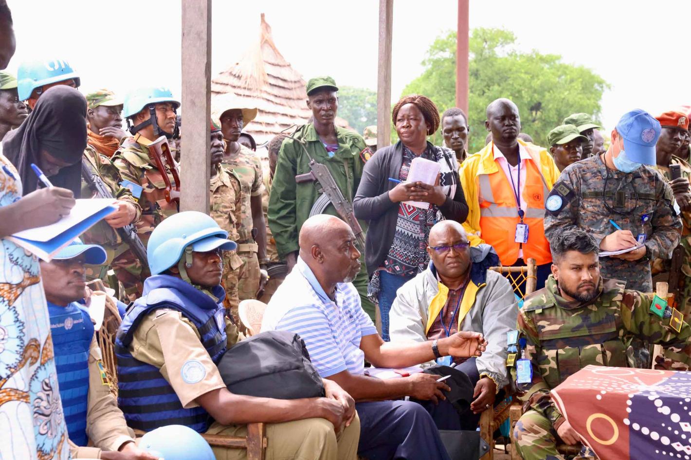Since conflict erupted at the end of June this year, communities in Rualbet, Warrap, have suffered greatly. Currently, stability is slowly returning to the area but humanitarian needs are growing, exacerbated by the rainy season. A high-level delegation, including government officials and humanitarian partners, joined an UNMISS air patrol to convene with community members and assess the situation on the ground. Photo by Zejin Yin/UNMISS
