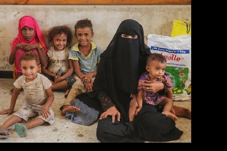 @ UNICEF - A woman and children wait as UNICEF-supported emergency humanitarian supplies are distributed in Hudaydah, Yemen, in June 2018.