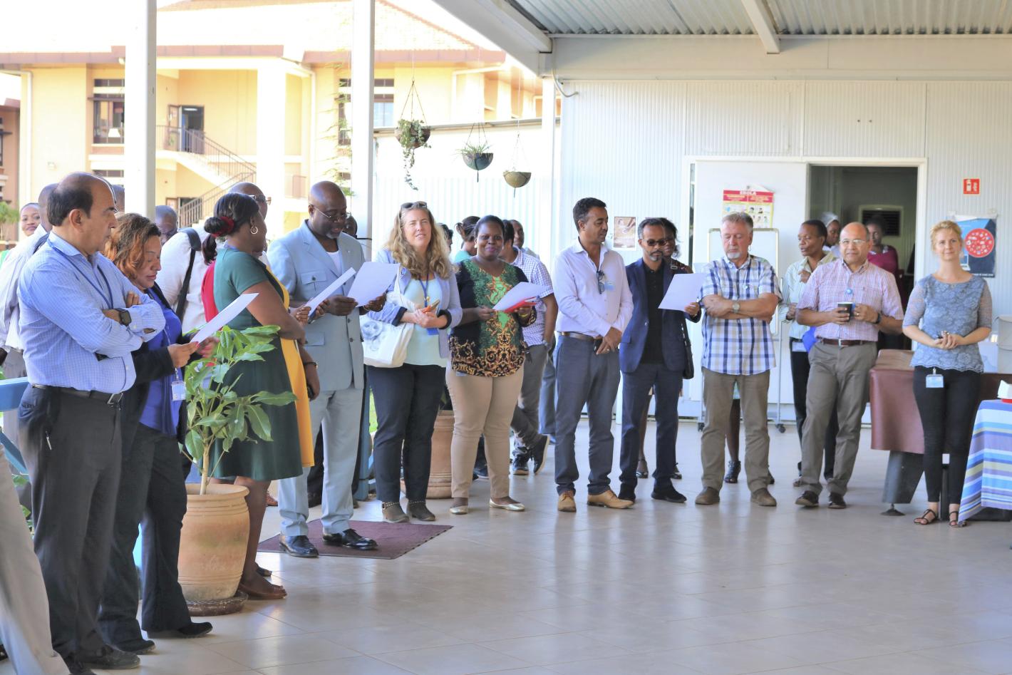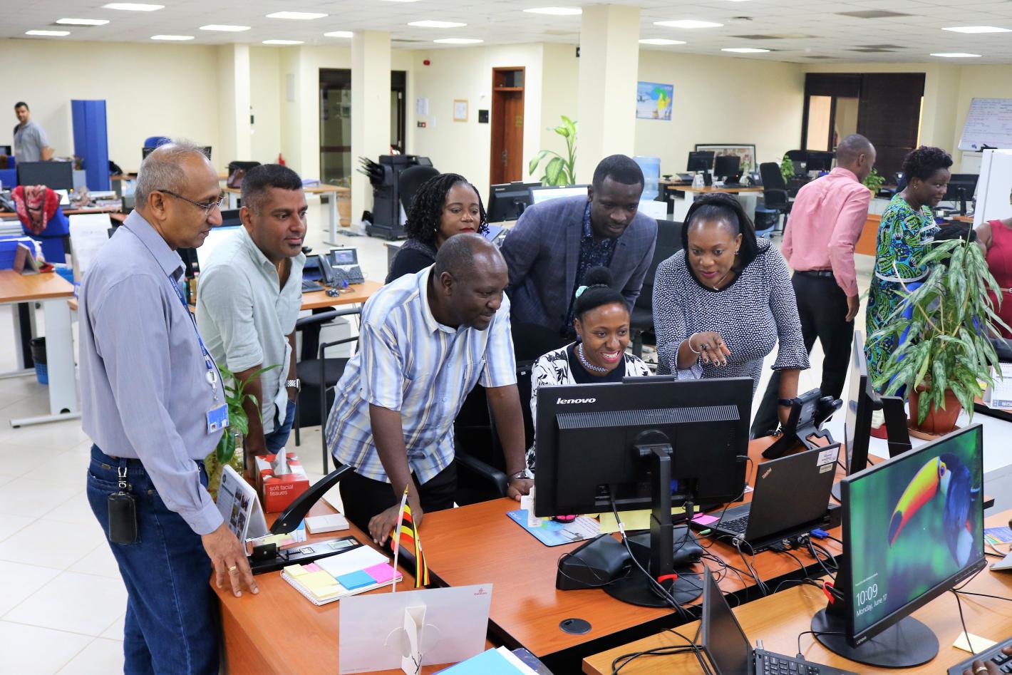 Entebbe, UGANDA (Oct. 23, 2018) – Surrounded by staff as well as visiting senior management of OICT and the RSCE Client Board, Mr. Paulin Djomo, Chief RSCE along with Ms. Stephani Scheer, Director of Mission Support, United…
